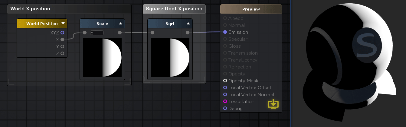 The Sqrt Node outputs the square root of a scalar or of the individual components of vectors defined by its Input value.